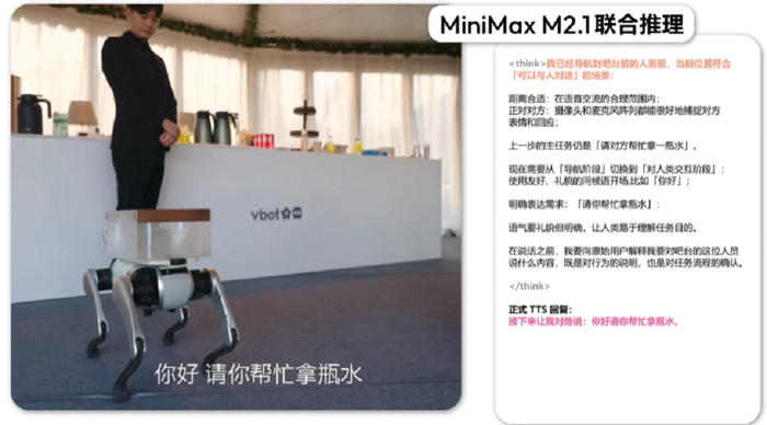 比如,MiniMax M2.1可以直接用于驱动机器狗,理解用户“帮我去后面的吧台那瓶水来”的需求。模型能理解压力传感器变化意味着物品已经被放置,然后转身回去找用户。