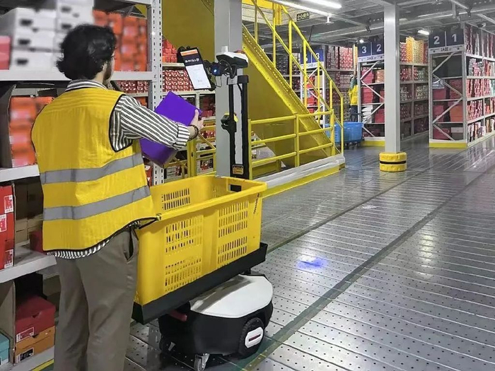 Syrius炬星的AMR解决方案是一种人机协作模式。适应传统的仓库布局,不挪动货架,让机器人指引着拣货员进入货架间穿梭,把需要分拣的货物直接放进机器人携带的料盒里,再汇合到总分拣区。