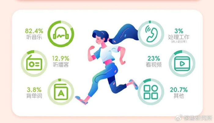 除了听音乐、看视频外,还有12.9%的人会选择听播客,3.8%的人会背单词,以及3.0%的人能够运动与工作(线上会议等)两不误。
