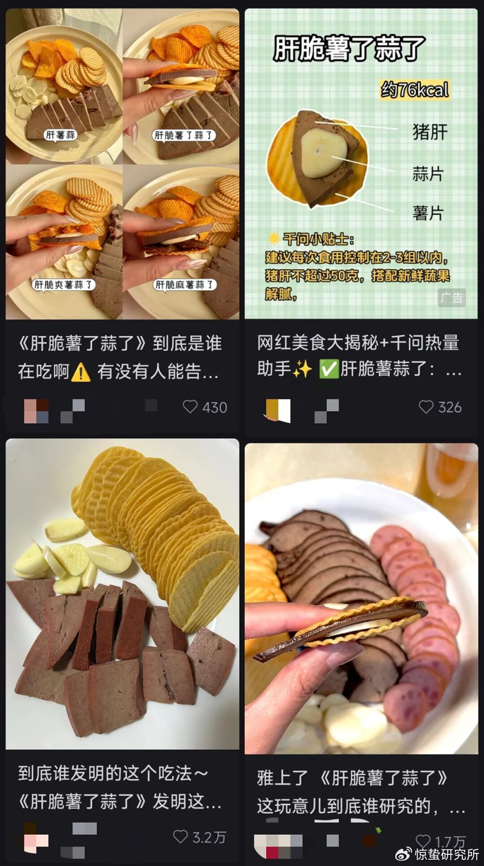 此外,卤猪肝、薯片、生蒜片作为日常生活中最常见的食材,也让这一爆款产品完美适配所有想要跟上这波潮流的吃货们。而“肝脆薯了蒜了”的谐音梗“干脆X了算了”也成为精准戳中年轻人自嘲情绪的社交货币,在社交媒体自带流量体质。
