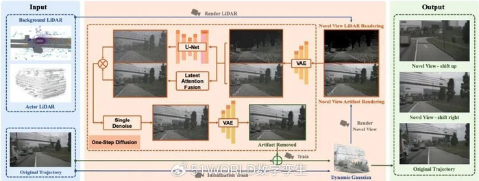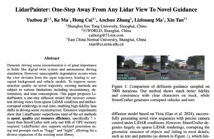 51Sim与研究团队在此次入选的论文《LidarPainter: One-Step Away From Any Lidar View To Novel Guidance》提出了一种全新的单步扩散新视角合成模型——LidarPainter,可在极低算力消耗下实现高保真、实时的动态驾驶场景生成,突破高阶驾驶仿真重建的置信度和效率瓶颈。
