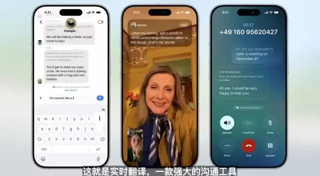 iOS 26还新增了实时翻译功能,无需联网,设备端运行,可以在短信、Facetime、电话、音乐中开启实时翻译+字幕功能。