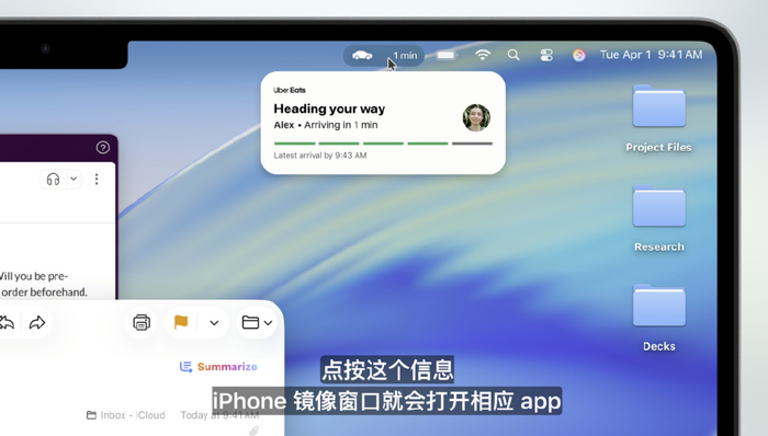 iOS和macOS的生态融合更加完善,电脑就能处理绝大多数iPhone中的任务,用户点击实时活动时,应用程序会在 macOS 中的 iPhone 镜像中打开。