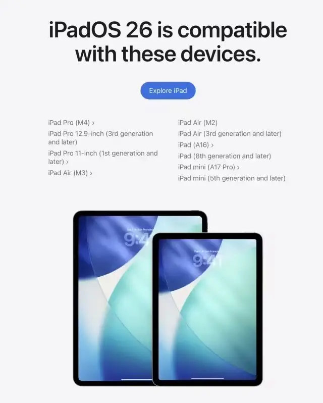 新版系统支持以下设备:iPad Pro M4,iPad Pro 11 英寸(第一代和后续版本),iPad Pro 12.9 英寸(第三代和后续版本),iPad Air M2,iPad Air M3,iPad Air(第三代和后续版本),iPad(A16),iPad(第八代和后续版本),iPad mini(A17 Pro),iPad mini(第五代和后续版本)。