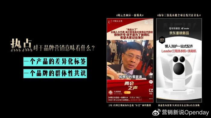 热点不仅是微博平台上流动的注意力符号,更是洞察消费趋势、塑造品牌差异化的关键窗口。今年3月,海尔借助两会期间总裁周云杰产生的自然热度,敏锐捕捉到用户对“内衣袜子分区洗”的显性诉求,并迅速响应,推出三筒洗衣机。