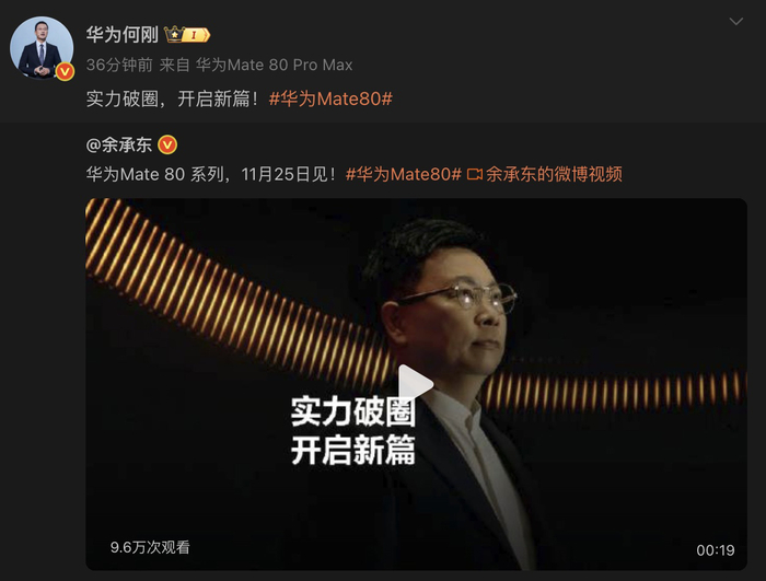 值得一提的是,11月17日华为终端华为终端BG董事长余承东和华为终端华为终端BG首席执行官何刚均使用新机发了微博,小尾巴显示“华为Mate 80 Pro Max”,这款机型应该是此前Mate系列Pro+或RS机型的改名,可能会采用6.9英寸甚至更大的直屏。