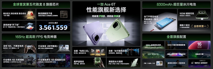 一加Ace 6T号称“性能旗舰的新选择”,采用高通新近推出的第五代骁龙8处理器,安兔兔跑分略微超过骁龙8至尊版。一加中国区总裁李杰表示,第五代骁龙8性能仅次于第五代骁龙8至尊版,言下之意,一加Ace 6T的性能会比价格高一些的一加Ace 6更强。