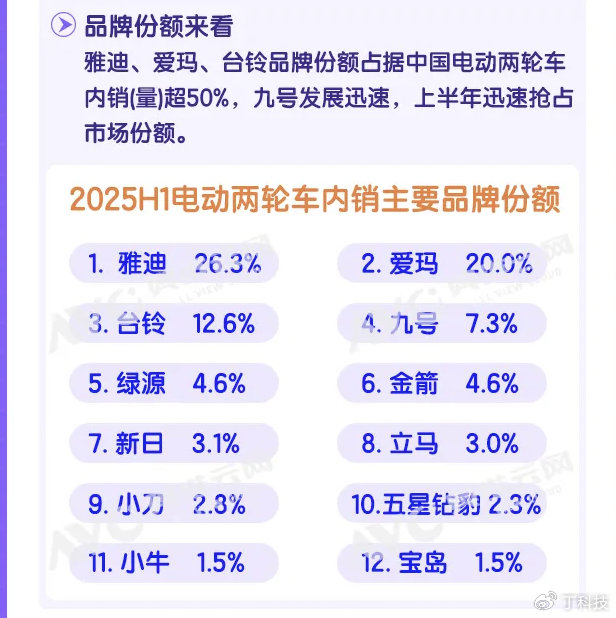 在这一轮增长浪潮中,品牌格局呈现“百花齐放”与“加速分化”并存的局面。钉科技注意到,传统头部品牌凭借深厚的渠道根基和品牌认知,依然占据主导地位。雅迪以26.3%的绝对领先份额稳坐头把交椅,展现出强大的市场统治力。爱玛紧随其后,占据20.0%的市场份额,稳居第二。台铃则以12.6%的份额位居第三,传统“三强”格局依然稳固,合计份额接近六成,构成了市场的核心支柱。