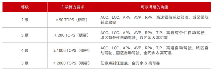 不同智能驾驶等级车端算力要求