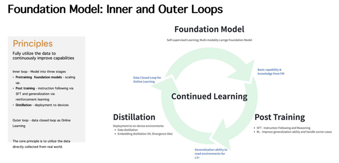 其进化核心在于 “双 Loop 协同机制”:Inner Loop 通过 “预训练 - 强化学习 - 蒸馏” 三阶段,完成大模型能力向车端的高效迁移;Outer Loop 依托真实车辆的感知数据、用户反馈及极端案例,持续反哺云端模型迭代,彻底解决仿真与真实场景脱节问题。这种 “云端训智、车端用智、数据回智” 的闭环,既让车端小模型具备接近大模型的泛化能力,又实现智驾系统的持续自进化,为 L3 的安全落地与向 L4 进阶奠定了技术基础。