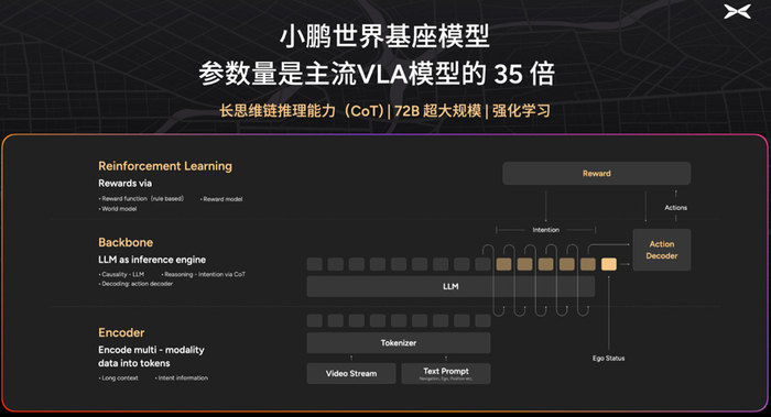 2025年4月发布的 “小鹏世界基座模型”,正是这一逻辑的落地载体。作为跨终端的 “超级母体”,它通过小鹏打造的 “云端模型工厂” 实现全链路生产:从多模态预训练、强化学习后训练,到模型蒸馏、车端部署形成闭环,依托万卡智算集群将迭代周期压缩至平均 5 天一次。