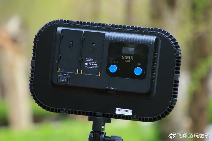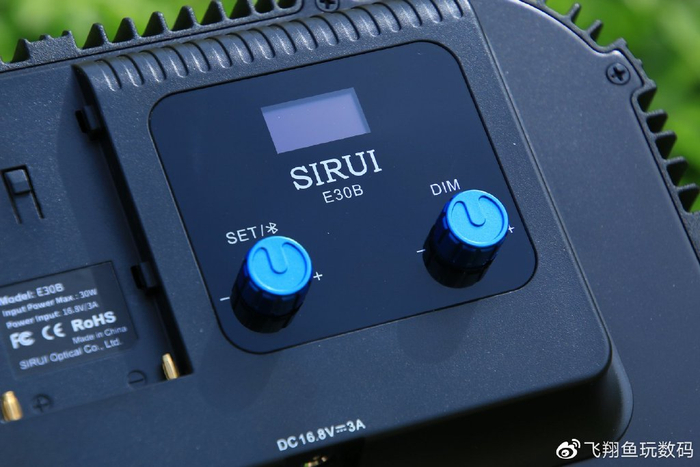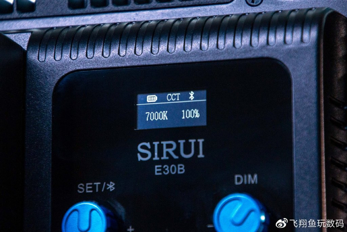 E30B柔光灯的背面右上侧为补光灯的主控面板,一块小小的屏幕,用来显示补光灯的状态及参数,两颗浅蓝色的旋钮可以调节补光灯的色温、亮度、灯效等相关参数。