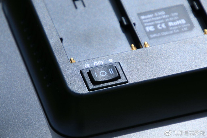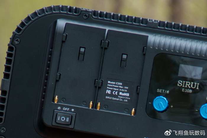 E30B柔光灯支持两种供电方式,有源的电源适配器和无源的锂电池供电,电源开关采用单开双控设计,右开为电源适配器供电,左开为锂电池供电。