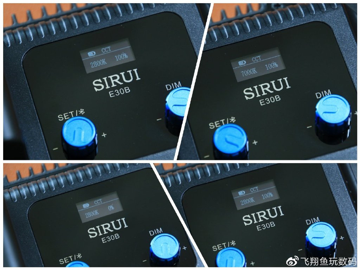 E30B柔光灯的色温调节范围为2800—7000K,我们可以通过左右旋转SET键进行调节,最小调节单位为100K,快速旋转则调节单位也变大,也会相应实现大范围色温的调节。柔光灯的亮度则是通过左右旋转DIM键来实现的,可调范围0%-100%。这种设计可以满足不同场景的使用。