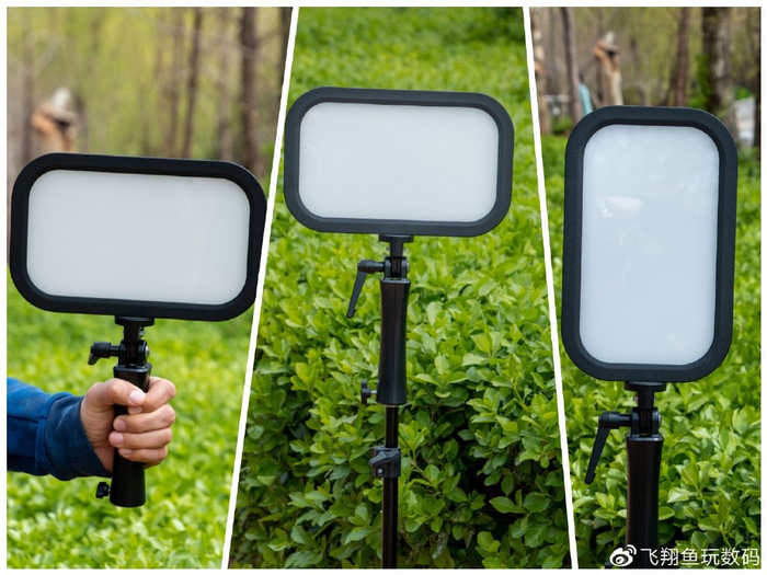 E30B柔光灯的底部和左右方向均有一个1/4螺丝接口,可以连接多功能手柄和相机三脚架,实现手持、横向和竖向等场景的应用,还可以通过手柄底部的接口拓展连接灯架使用。