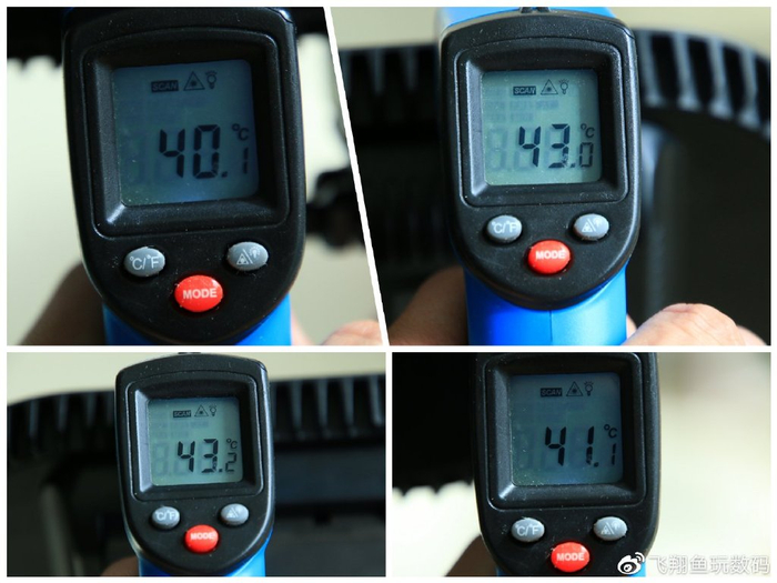 得益于鲨鱼鳍状的铝合金栅格边框设计,E30B柔光灯的散热效果非常出色,实测100%亮度,工作一小时后最高温度也只有43.2℃。
