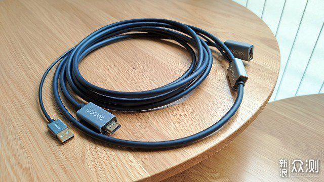 酷睿视(GOOVIS)Lite头戴影院,内置没有采用锂电池的设计。供电是通过一个符合HDMI 1.4a标准、图像输入+供电用的HDMI接口来实现的。为了解决连接的局限性,自购私人定制限量版的4米HDMI分接线,是最佳的解决方案。