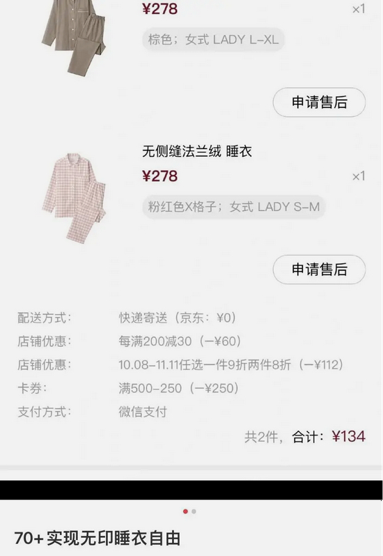 好在最终成交的价格还是比原价低了不少:原价278的法兰绒睡衣,到手只花了137。
