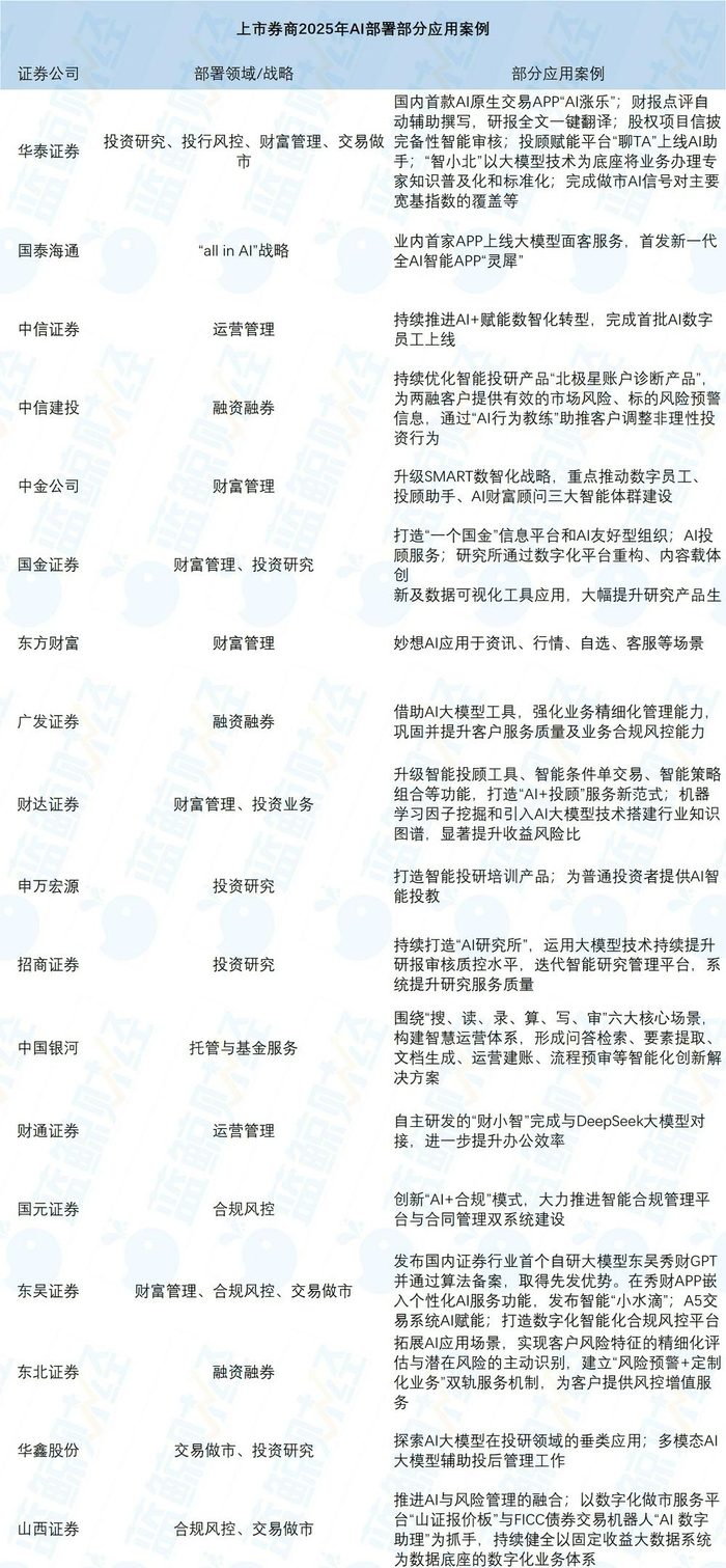 从记者观察来看,AI已是券商对外输出的关键词,从头部券商到中小券商,均试图在不同的业务场景中积极探索或展示自身的AI实力,业务应用层面,财富管理和投研是覆盖较为广泛的领域。