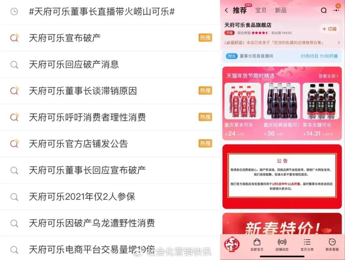 微博平台上的热搜也可能会带来淘宝的热搜。社交话题能登上热门,往往在于它对大众社会情绪的激发,这就会促使人们主动寻找与之相关的商品或服务,流量自然外溢到淘宝等电商平台。在天府可乐身上,我们发现其品牌在微博的热搜和淘宝的热搜出现正相关关系,由此可见微博等社交平台的热搜能促进一些消费者情绪驱动的消费行为。