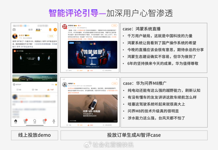 在华为问界M8的推广中,“智能评论引导”展示了其生成多样化评论的能力:紧扣卖点,如“纯电动还能有这么强的越野能力,刷新认知”;强化场景,如以“涉水能力这么强,台风天都不怕了”;巧妙设问,如“有没有懂车的友友讲讲这款车续航怎么样”……热闹的评论区让讨论自然生长。AI通过生成多样化的评论模板,引导用户加入讨论,帮助他们快速表达观点,降低互动门槛。