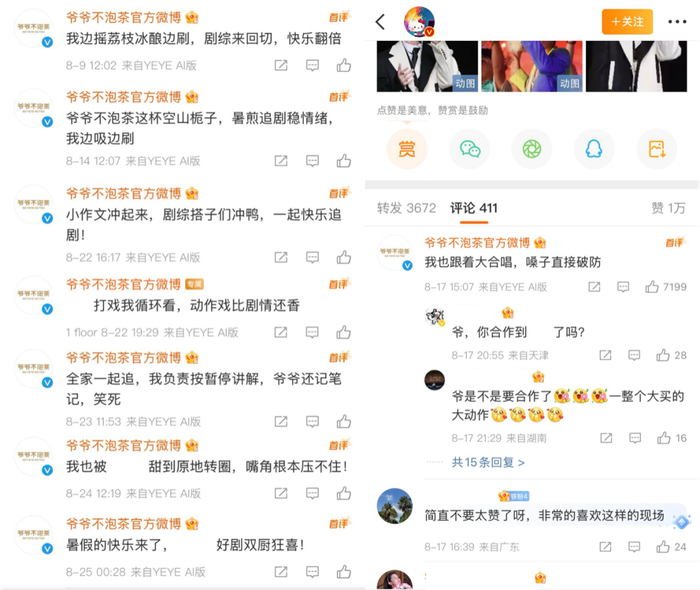 当网友沉浸在剧情中并自发讨论时,茶饮品牌@爷爷不泡茶官方微博总能在第一时间出现在各个评论区,以朋友般的口吻接住话题。