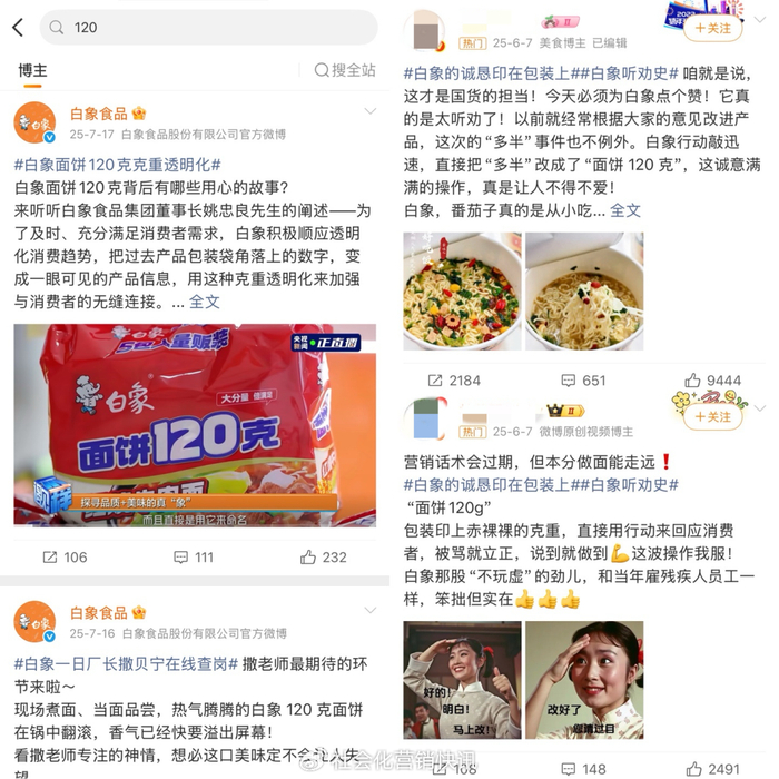 此前白象“多半”系列产品因注册商标引发争议后,品牌仅用48小时便宣布将产品名称直接改为面饼120克/ 110克,把模糊表达改成用户最在意的确定性信息,这也是在用最直观的信息回应用户的诉求。