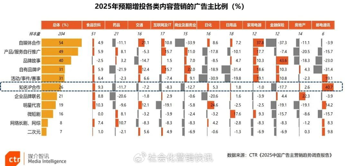 在CTR最新的《2025中国广告主营销趋势调查报告》中提到,广告主认为内容可以为流量注入“温度”,内容与流量也可以形成高度融合。自媒体合作、品牌故事、活动赛事、微短剧等等都是品牌今年在内容营销上会考虑的方向。而在众多内容营销的形式中,快消品、邮电通讯类广告主对与知名IP合作这类内容的青睐有加,计划增投这类内容营销形式的广告主比例较高。