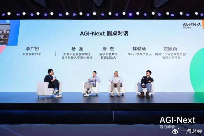 上周末,清华大学AGI峰会邀请了国内AI圈的技术大咖——腾讯“CEO/总裁办公室”首席AI科学家姚顺雨、月之暗面创始人杨植麟、阿里Qwen技术负责人林俊旸和智谱创始人唐杰。