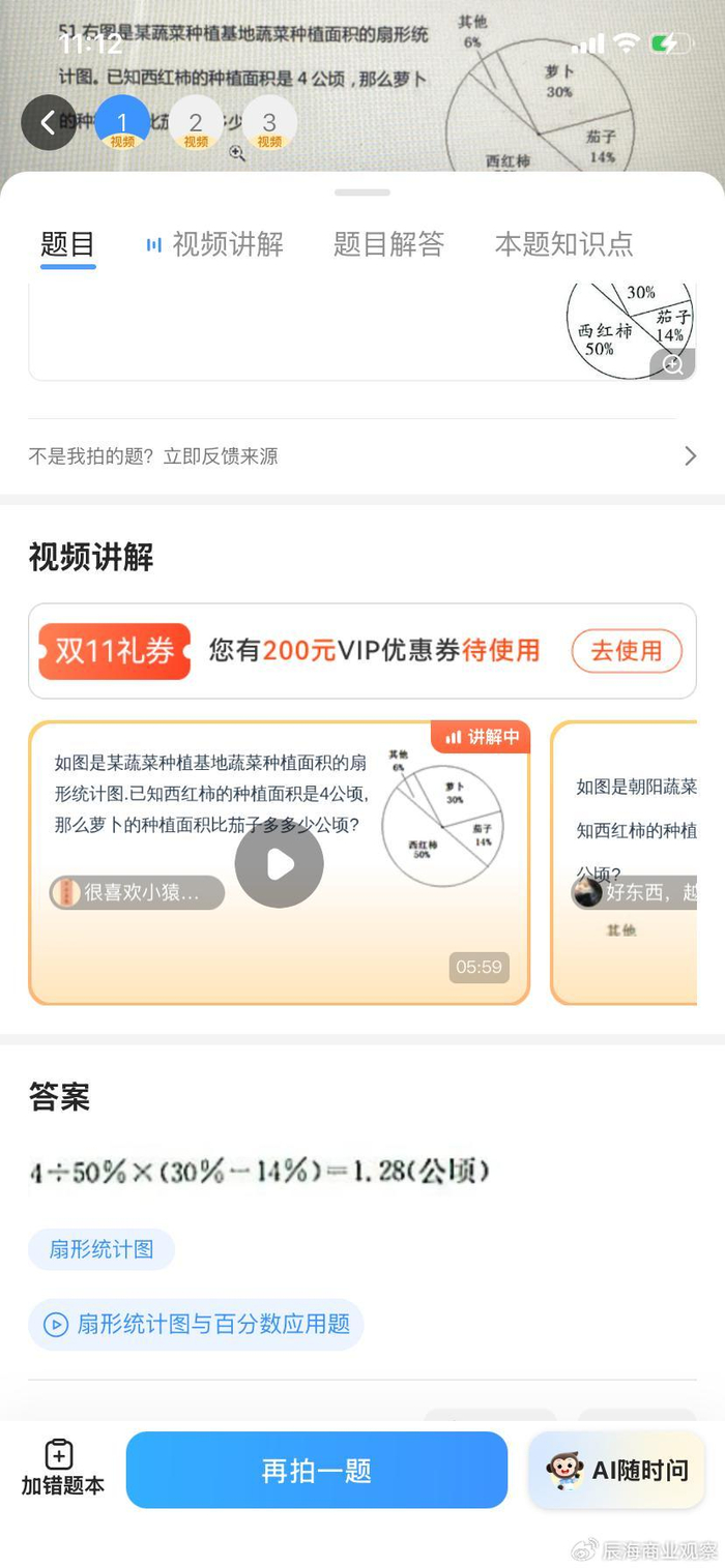 小猿搜题是提供讲解视频,再搭配一个AI机器人,可以随时提问。不过视频讲解其实就是提前录制的真人老师讲题,还属于过去题库的模式,先准备好题目,用户搜索到自动调取该题目。这并不算是真正的互动,仍是教学式视频,而且需要购买VIP才能观看。