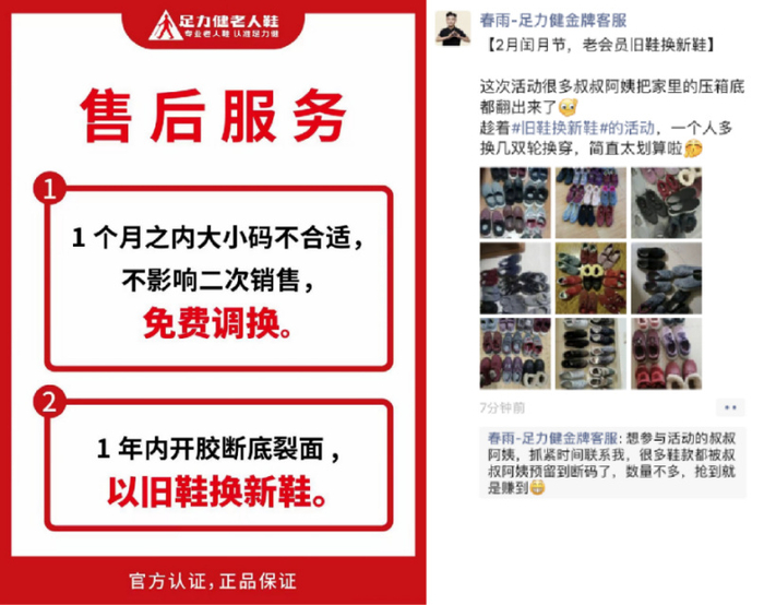 2月14日-17日,足力健老人鞋在私域端口推出了“闺月换新节”活动。老会员在官方社群中凭借身着足力健相关产品的照片,可参与低价换购一双新鞋的活动。且购买的新鞋也能够享受到足力健老人鞋的超行业质保政策,即“1月之内不影响二次销售的前提下,免费调换”、“1年内开胶断底裂面,以旧鞋换新鞋”。该活动不仅能够以性价比极高的价格购买到高质量的产品,还能享受到“无后顾之忧”的质保服务,在预热期就引起了广大消费用户的关注,并积极参与其中。