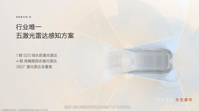 那这次极氪 9X 就用了 5 颗,哎,前面再加了一颗固态,根据下面这张图,脖子哥估计,是因为主雷达的范围比较窄,再来一颗可以扩大视野,减少盲区,更多是一些锦上添花的作用。
