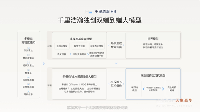千里浩瀚 H9 和前几个智驾的区别就在于这个双端到端大模型,云端构建了基座大模型和世界模型,车端还有VLA通用大模型和端到端安全对抗模型。