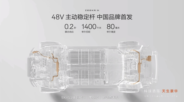 说完这俩,然后再来聊聊这回 9X 的独特技术,48V 主动稳定杆。可以这么说,虽然这次 9X 没用上主动悬架,但是用了一个主动的稳定杆,这算不算半个主动了?