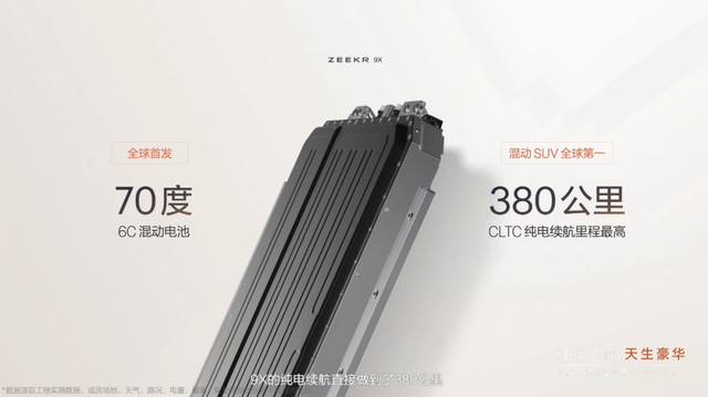 9X 用了不同于市面上的 52.3 度混动电池包,而是搭载了 70 度的 6C 电池包, CLTC 纯电续航有 380 km。而且还是全栈 900V 高压,充电 20%-80% 只要 9 分钟。