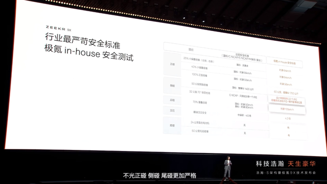 这次 9X 用了 91% 高强度钢&铝合金,以及 41600N·m/deg 的扭转刚度,另外,在安全测试标准上,极氪自创了一套 in-house 标准,对碰撞的时速有更高的标准。