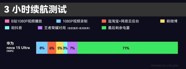 比如 6500mAh 的电池,跑完三个小时的续航模型,还剩余 71% 的电量,甚至跟旗舰 Mate 80 Pro Max 的表现相当,基本能保障一天的日常使用。。。
