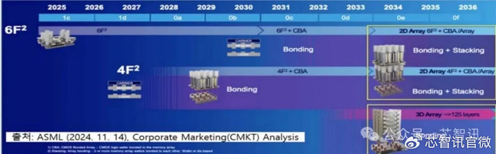 除了逻辑制程,內存技术的演进节奏与0.2nm逻辑制程高度同步。在DRAM 领域,传统BCAT 构架预期将在7~8nm遭遇微缩极限,未来将转向垂直信道晶体管、堆叠式DRAM、4F² 单元,以及通过Hybrid Bonding (混合键合)将CMOS 电路直接与数组內存结合的CBA(CMOS Bonded Array) 构架,延续密度与性能提升。