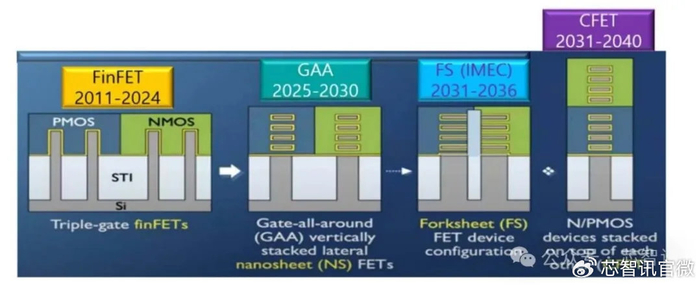为延续摩尔定律,逻辑元件将由FinFET 转向GAA(Gate-All-Around),并进一步演进至CFET(Complementary FET) 等三维晶体管结构,通过将PMOS 与NMOS 垂直堆叠,突破平面密度限制。配合Monolithic 3D(单晶3D) 制程,以及由DTCO 迈向STCO(系统-制程共同最佳化)的设计思维,未来性能提升将来自整体构架重整,而非单一制程节点的微缩。