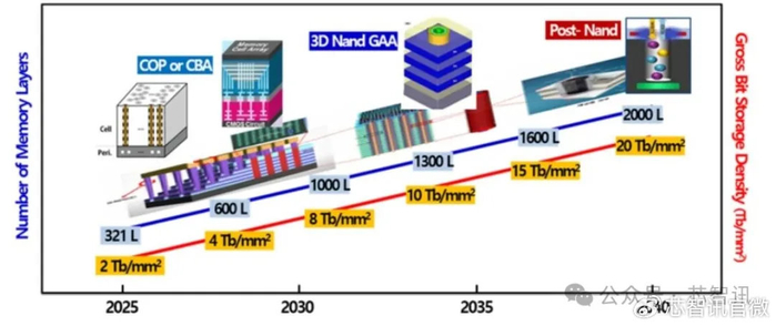 至于NAND Flash,则走向“以层数换密度”的发展路径,预期自321层,推进至2031年约1000层,并在2040年挑战2000层。