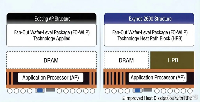 三星近年来一直在提升Exynos 处理器的性能与效率,其回顾其技术发展,三星首先在Exynos 2400 中导入了扇出型晶圆级封装(FOWLP)技术,成为首款采用该技术的芯片。随后,在其首款2nm GAA 技术制程的系统单晶片(SoC)的Exynos 2600 当中,三星引进了热传导块(Heat Pass Block,HPB)技术,借此优化热管理并降低发热量。