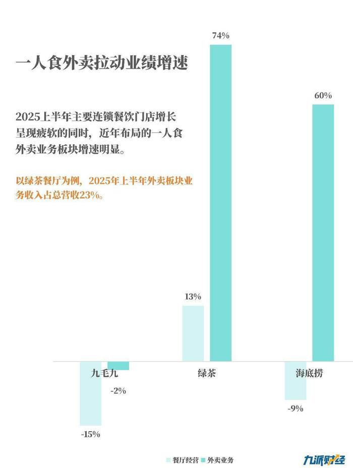 以中高端大餐定位的连锁餐厅,上半年却主要依赖一人食外卖业务拉动业绩增速。2025年上半年,太二、海底捞、怂火锅、九毛九等连锁餐饮同店销售额出现明显下滑,绿茶和海底捞两家的外卖业务板块收入却分别同比增长74%和60%,增速远高于餐厅经营板块的13%和-9%。