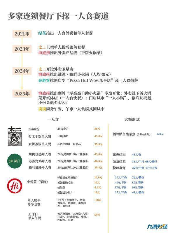 海底捞2023年首次推出定位一人食场景的“下饭菜”精品快餐业务,在上半年贡献了超55%外卖收入,并在近期落地开出首家实体店。而太二(九毛九集团旗下品牌)在2024年5月首次推出以一人食套餐为核心的外卖卫星店,2024年外卖业务收入同比增长15.8%。