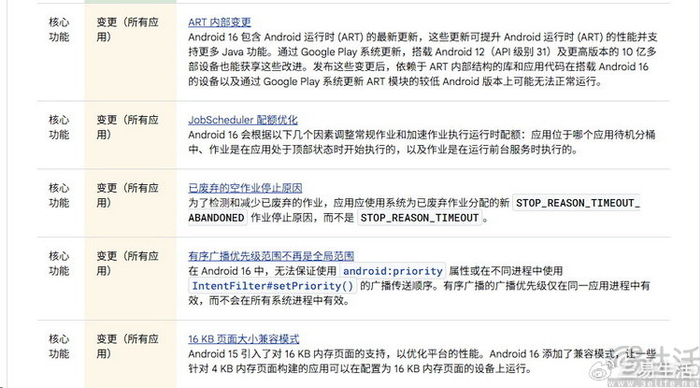 在谷歌的开发者网站上,可以很容易就找到Android 16目前版本的功能变更列表。根据这份表格的内容,Android 16的变化基本可以归纳为三个方面。