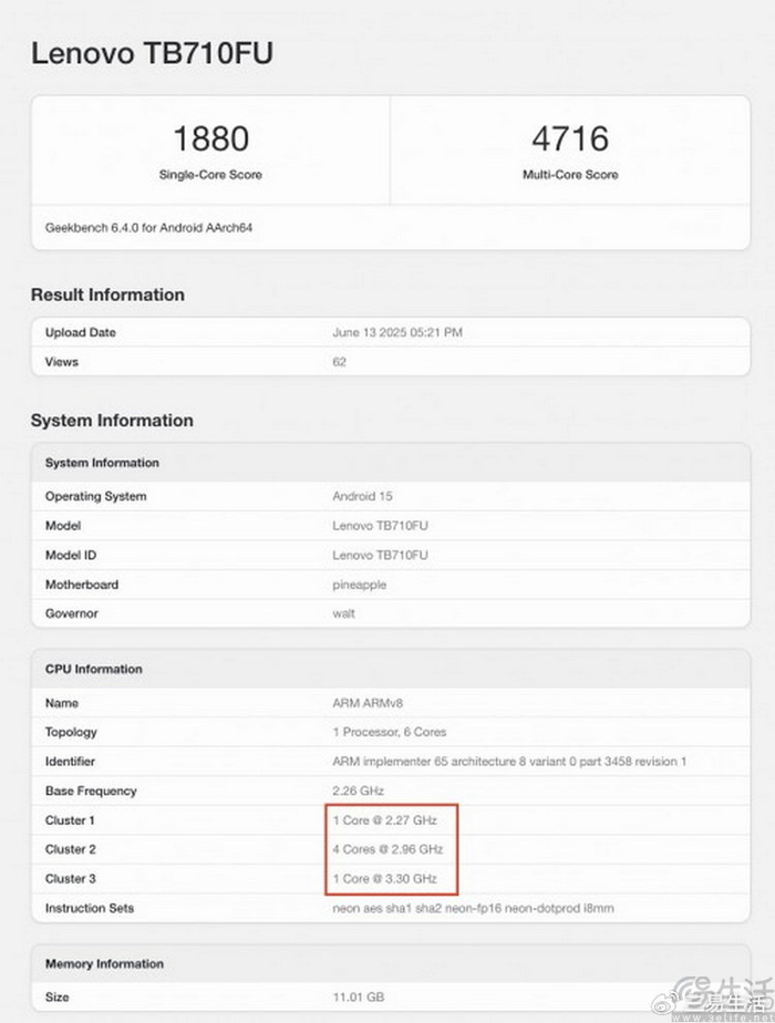 另一方面,能体现这种差异的更直接证据,出现在近日曝光的某款联想新款平板跑分成绩里。从中不难发现,这个新的“第三代骁龙8”采用了6核、而非之前的8核CPU配置。具体来说,其CPU是由一颗3.3GHz的Cortex-X4超大核、四颗2.96GHz的Cortex-A720大核,以及一颗2.27GHz的Cortex-A520小核组成。相比于“原版”的第三代骁龙8,至少删去了一颗A720大核与一颗A520小核,同时将原本3.15GHz的两颗A720核心进行了降频。