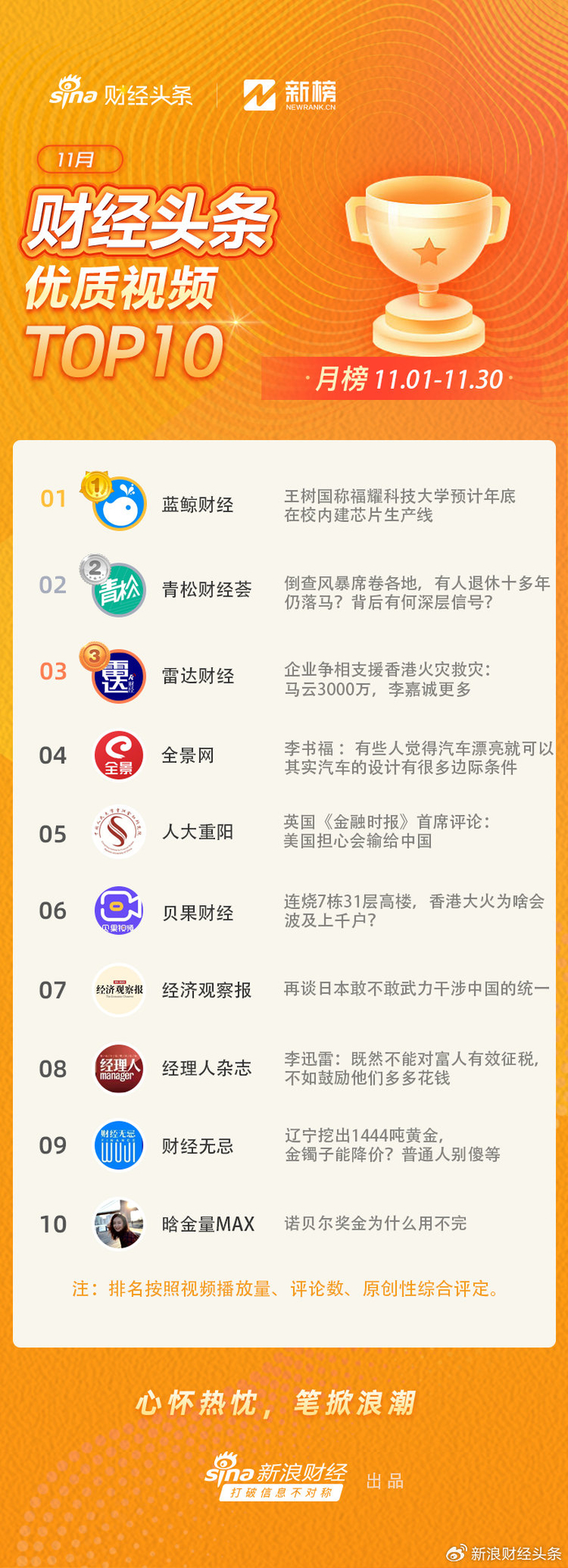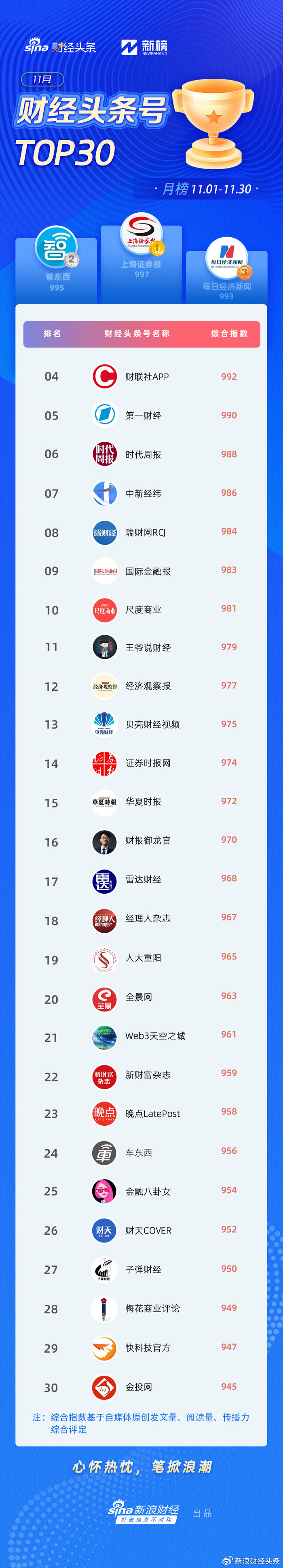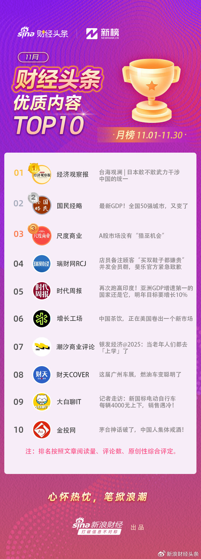2025年11月最新榜单公布!榜单以月为统计周期,全面梳理新浪财经头条各自媒体账号上月(11.01-11.30)运营数据,以发稿量、阅读量、播放量、评论量、原创力、传播力等指标为考核因子,最终确定本期榜单。