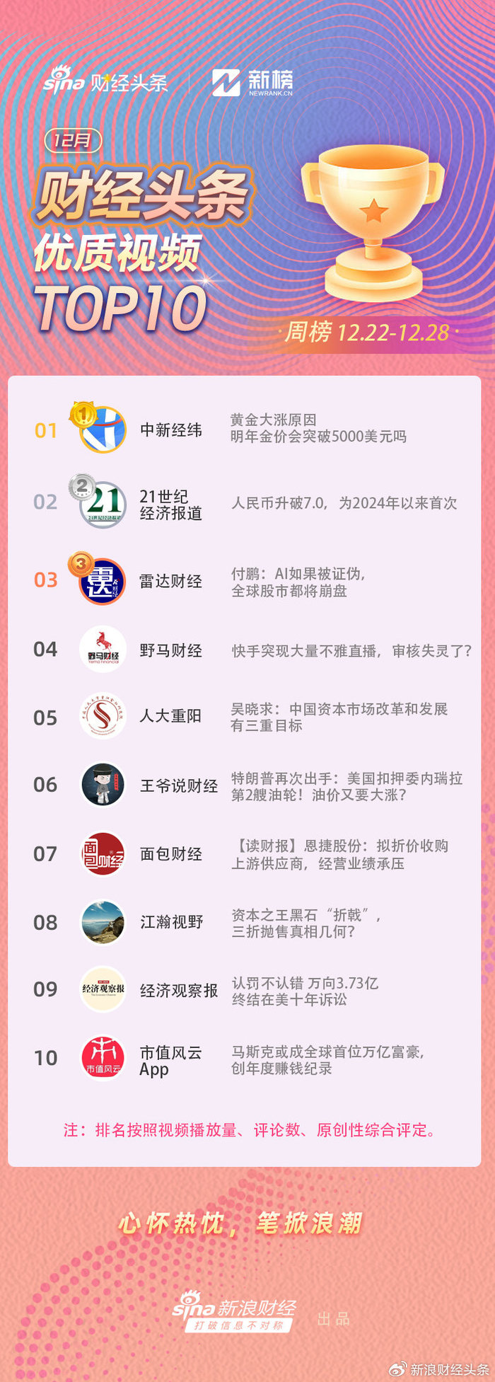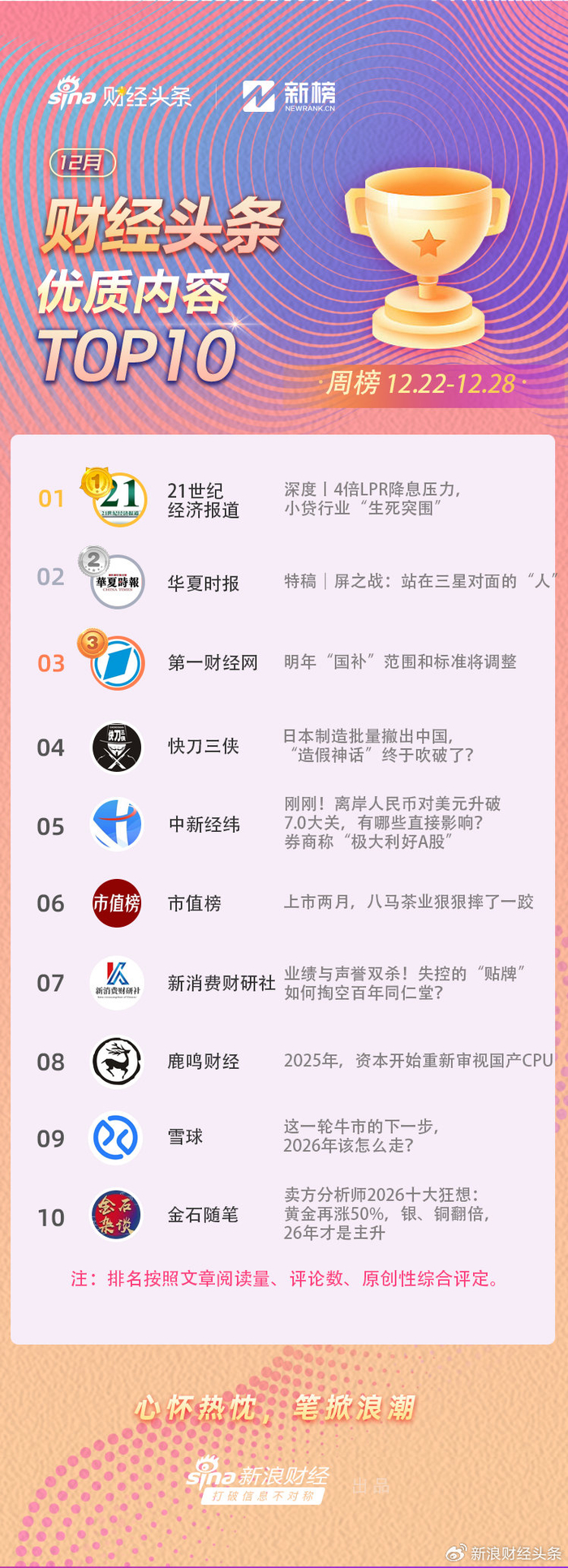 基于新浪平台的分发技术和流量优势,榜单以阅读量、播放量、原创度、专业度等指标为基准,综合评定出排名前十的优质内容!欢迎更多财经科技自媒体入驻新浪财经头条~