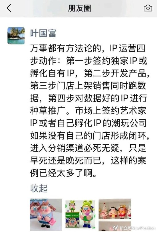 6 月媒体报道了叶国富在朋友圈的一则分享,除了对 IP 运营的方法论做了四步陈述,他还直言,市场上签约艺术家 IP 或者自己孵化 IP 的潮玩公司如果没有自己的门店形成闭环,进入分销渠道必死无疑,只是早死还是晚死而已。
