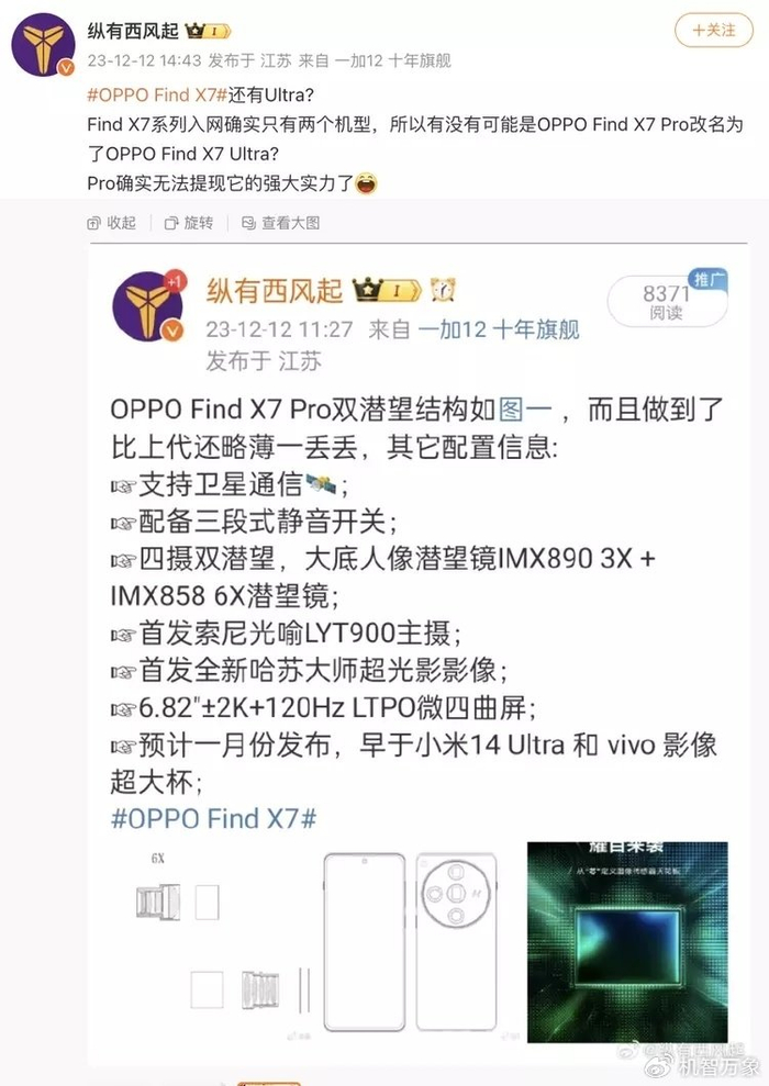 虽然理论上距离OPPO下一代旗舰机型Find X7系列的发布会还有一段时间,不过,近期关于该系列新机的爆料却越来越多,比如疑似该系列机型的国家质量3C认证截图、该机在渲染图和真机谍照以及诸多配置信息之外,日前,疑似该机的更多性能、续航、影像模块设计以及机型的消息也曝光了出来。从曝光的信息看,该系列新机有可能带来Ultra版,后摄模块中除了将采用双潜望镜头外,很可能延续上代的圆形设计等。