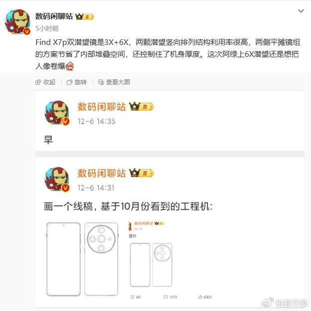 下方的是3X潜望长焦,型号是索尼IMX890,5000万像素,1/1.56英寸大底,支持OIS光学防抖。另外,OPPO Find X7 Pro还配备了1英寸超大底主摄,同样是5000万像素,型号是索尼LYT900,支持OIS光学防抖。同时,@数码闲聊站也爆料称,“Find X7p双潜望镜是3X+6X,两颗潜望竖向排列结构利用率很高,两侧平摊镜组的方案节省了内部堆叠空间,还控制住了机身厚度。这次阿绿上6X潜望还是想把人像卷爆”。